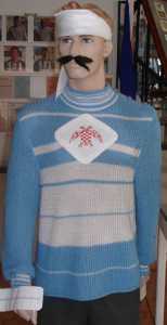 La parte superior del primer uniforme del Águilas Football Club no era una camiseta, sino un jersey de lana blanquiazul dividido en rayas horizontales de distinto grosor. En la parte superior del jersey, a la altura del pecho y sobre una especie de rombo de fondo blanco, estaba impresa la imagen del escudo: un águila bicéfala.